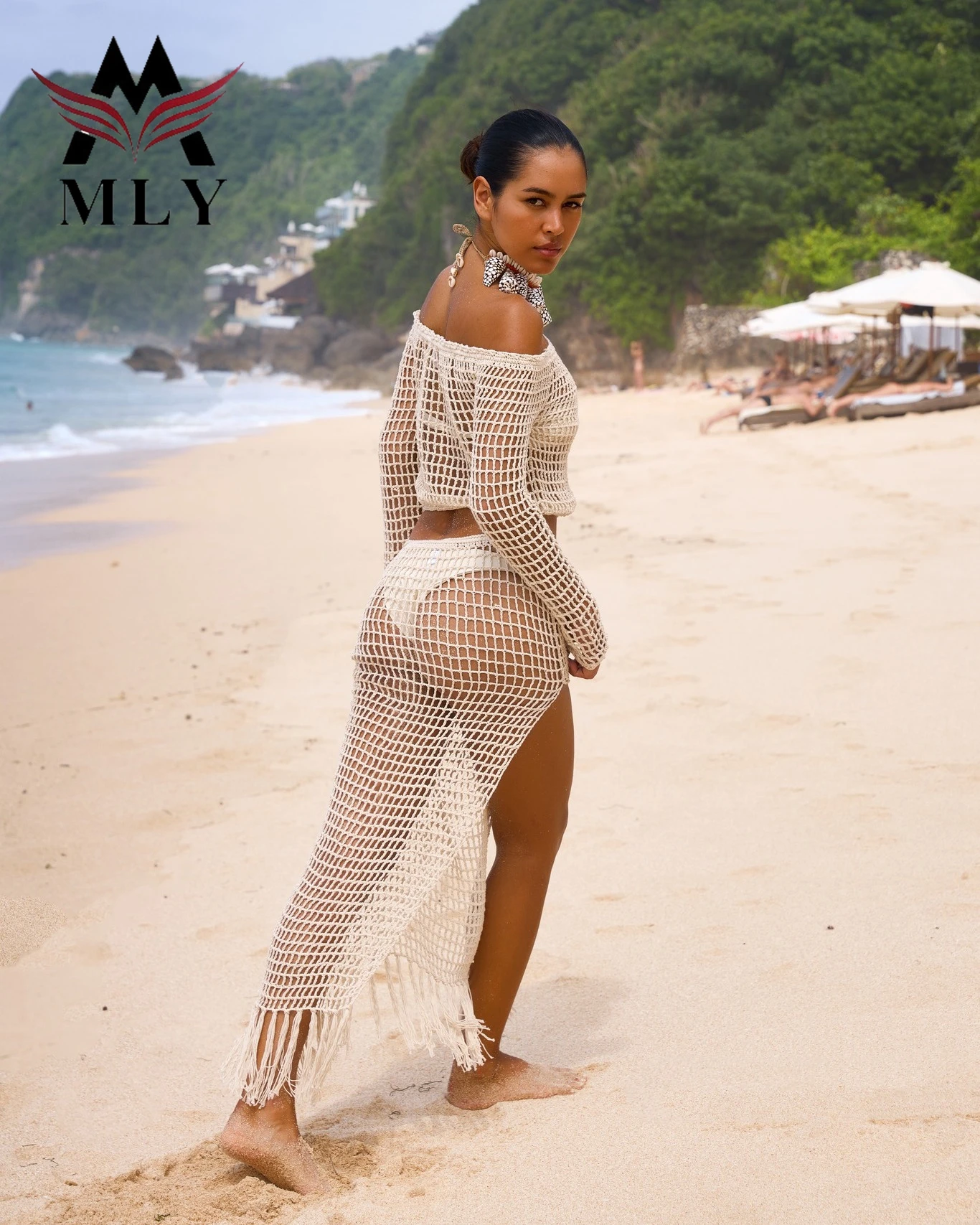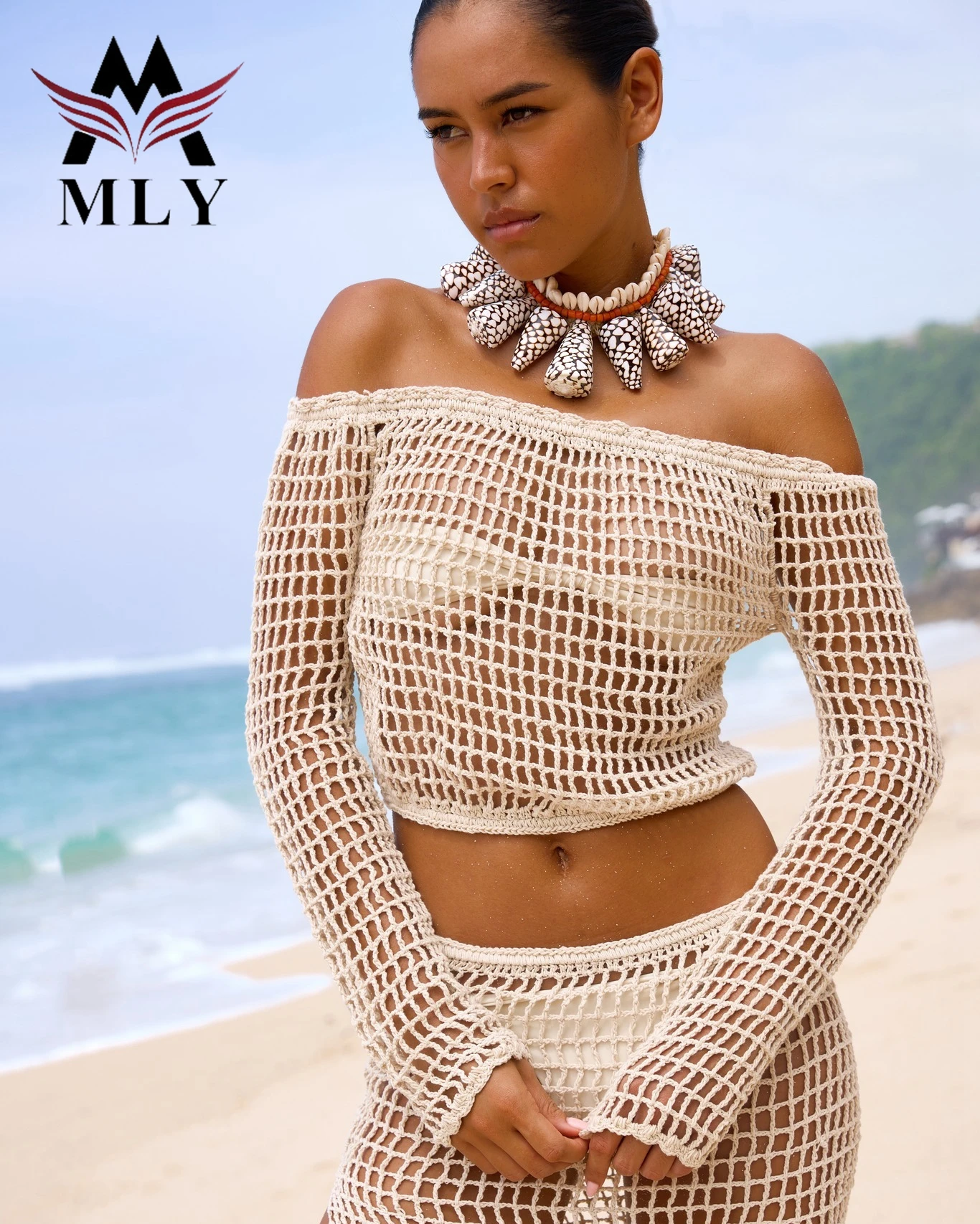 Summer Two Piece Swimwear Beachwear Knitted Crochet Mesh Long Sleeve Maxi Swimsuit Cover Ups Beach Dress
